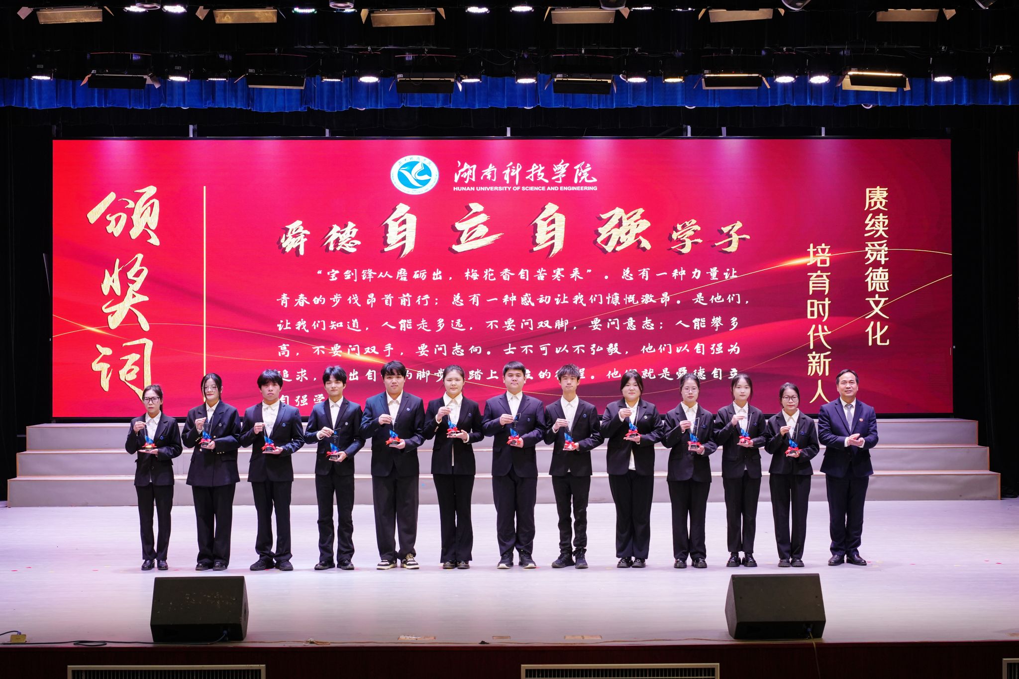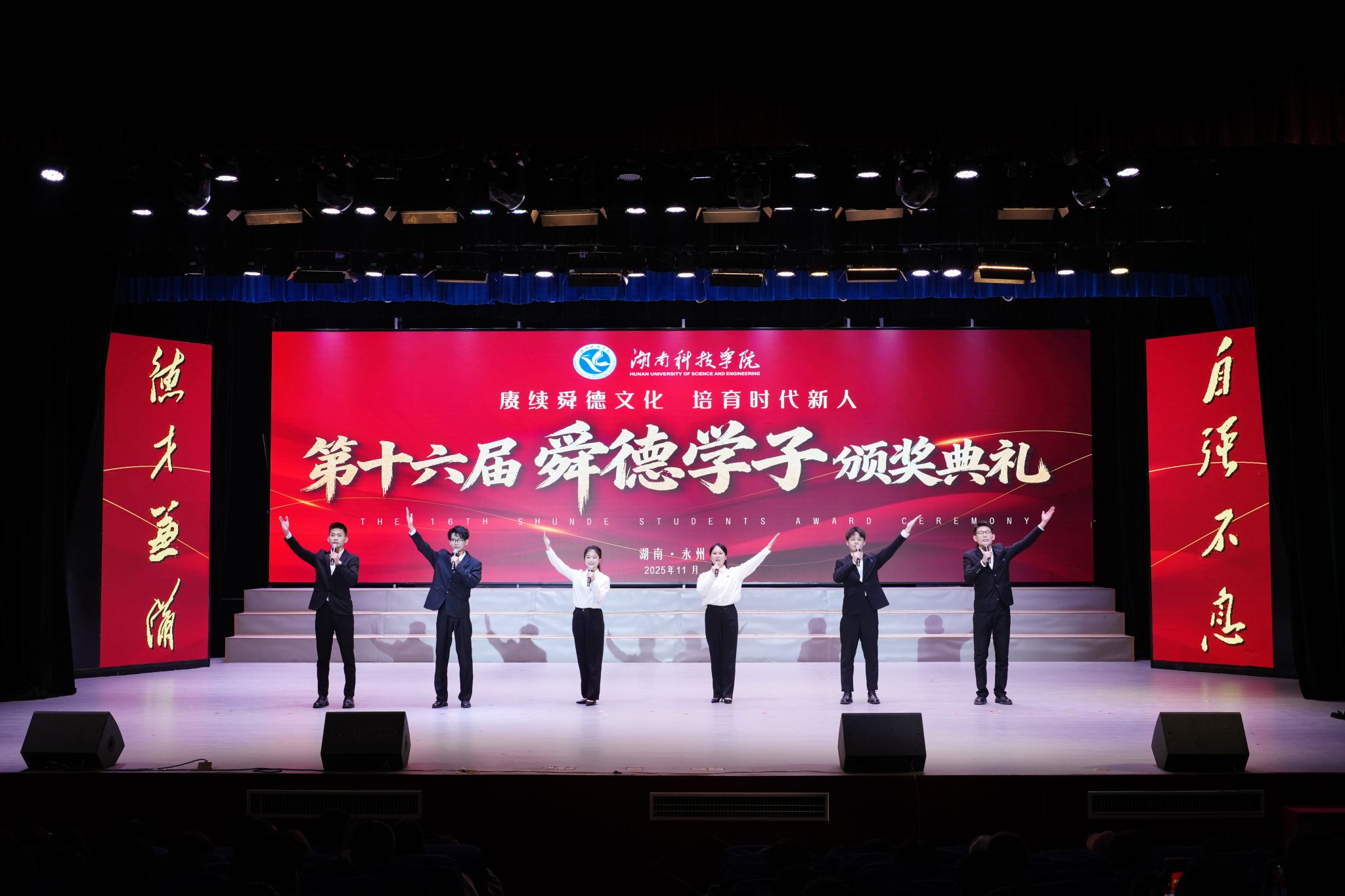 本网讯(记者 谷利梅 彭晥君 摄影 梁自元)舜德千载润青衿,薪火相传启新程。11月24日,我校举行第十六届“舜德学子”颁奖典礼,101名优秀学子获表彰。校党委书记李钢,党委副书记、校长黄创霞等全体在校校领导出席典礼。