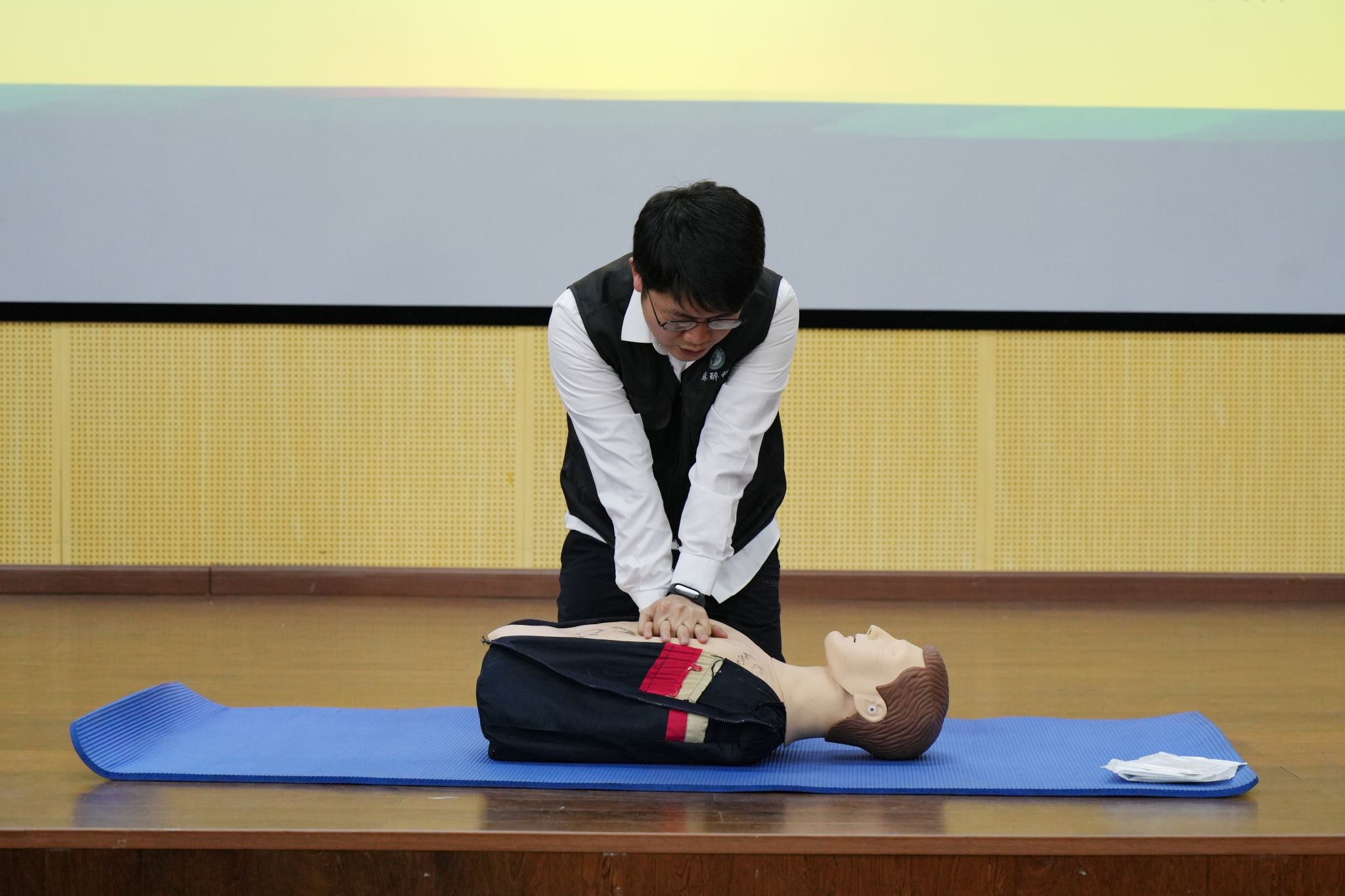 讲座结束后,两名医护专家开展了心肺复苏现场救护技术和电除颤救护技术实操示范,同学们在医护专家的指导下,分批体验现场救护操作,现场学习氛围浓厚。