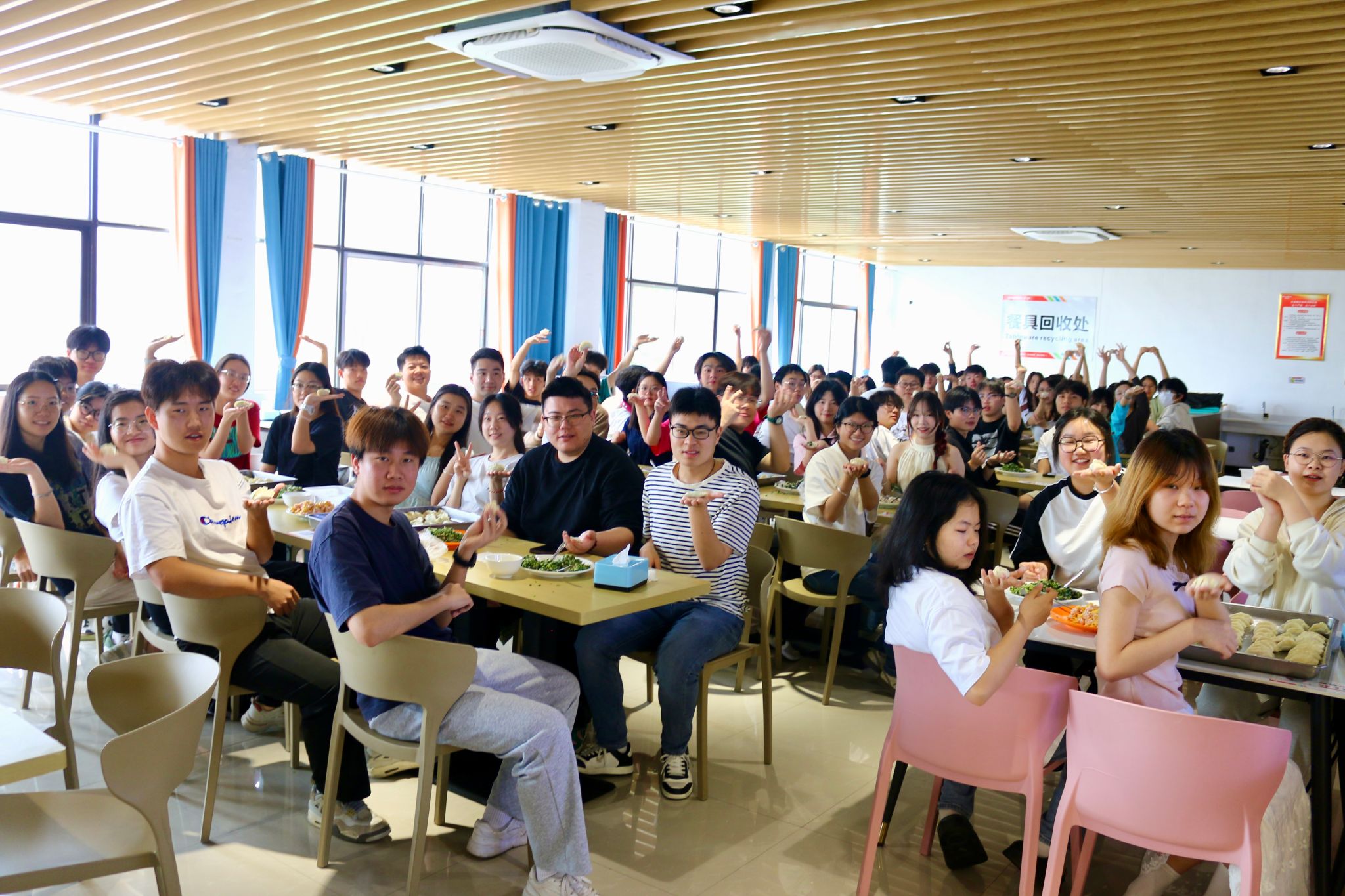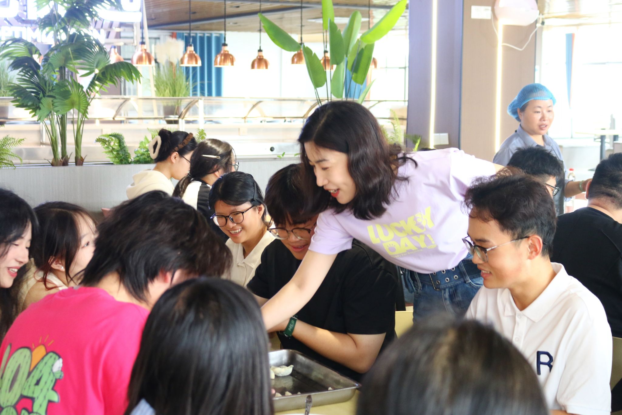 活动当天,百余名师生齐聚食堂,在食堂师傅的指导下,擀皮、调馅、包饺,分工协作间尽显劳动之美。老师与同学们围坐一桌,一边包饺子一边畅聊假期生活,鼓励大家在劳动中培养团队精神、提升实践能力。