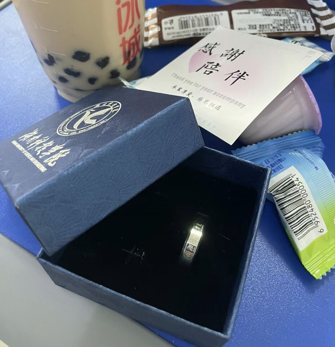 学院还送上精心定制的专属礼物,班主任为每位毕业生佩戴纪念戒指——外圈镌刻“js9900金沙”校名及校徽,内壁铭刻学生班级与姓名。正值“520”的特别日子,每位同学都收到玫瑰、奶茶和零食礼包,学生们将四年时光写在“我的大学回忆”明信片上,凝练成300字的青春诗行。