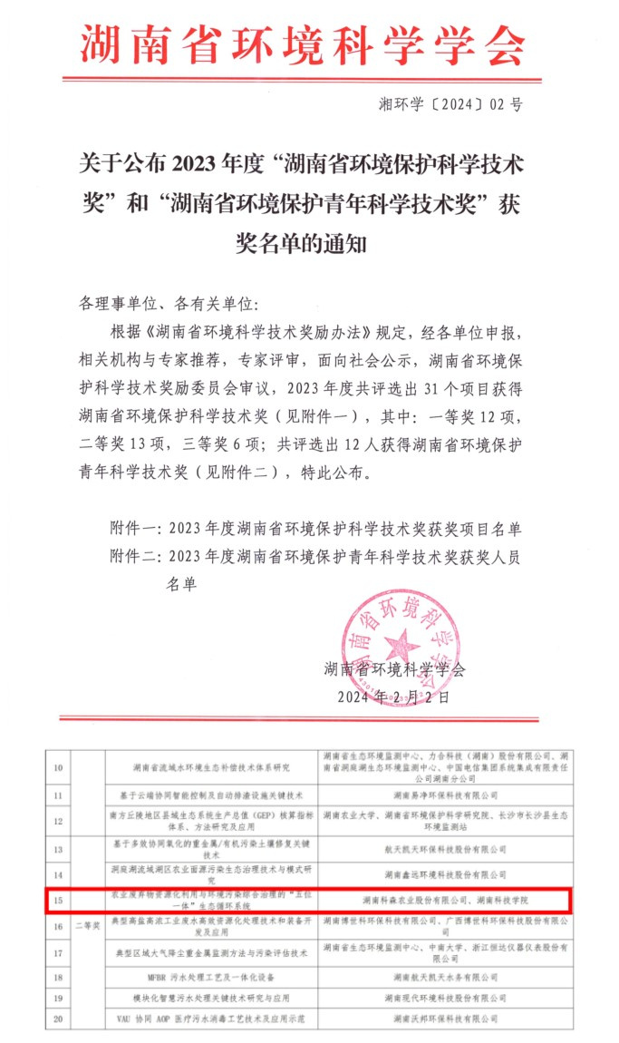 本网讯(通讯员 李尊华 刘乐)近日,湖南省环境科学学会对在我省生态环境相关领域的科学技术、科技成果转化、新技术引进与推广等方面做出突出贡献的个人和组织进行了表彰。生物化工学科博士团队成员覃佐东教授、李尊华博士和骆鹰博士联合湖南科森农业股份有限公司完成的《农业废弃物资源化利用与环境污染综合治理的“五位一体”生态循环系统》项目凭借其突出的创新性和实用性,在众多项目中脱颖而出,获湖南省环境保护科学技术二等奖。