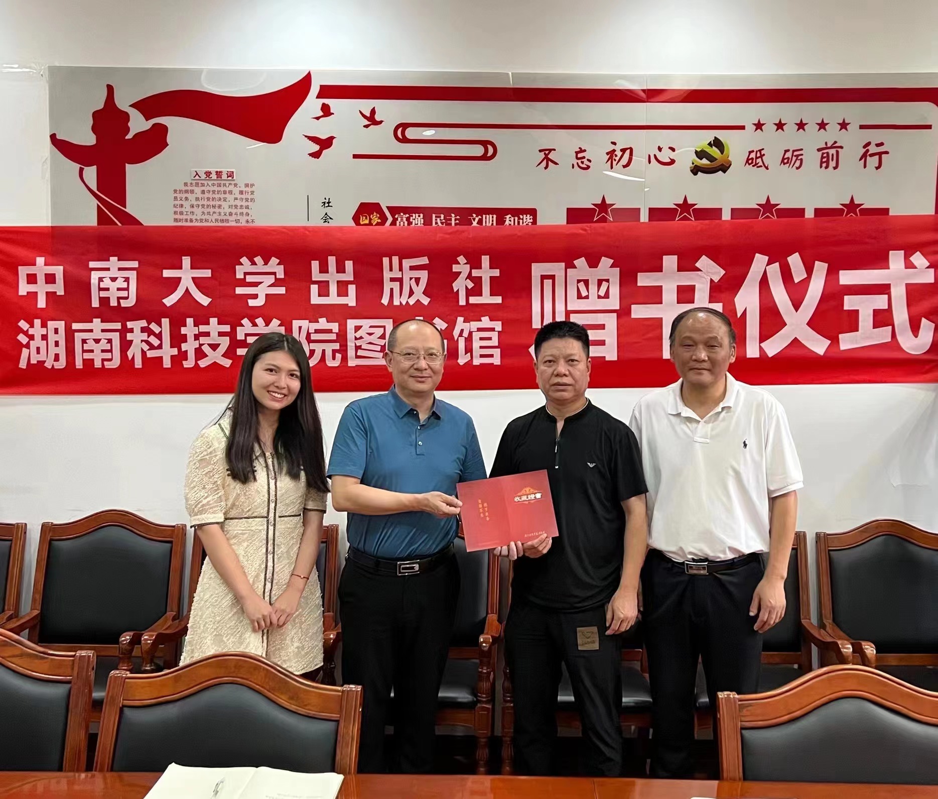 本网讯 6月29日,中南大学出版社向我校图书馆捐赠图书仪式在中南大学出版社大楼举行。中南大学出版社社长吴湘华,我校原副校长程智开,图书馆馆长杨增和等出席捐书仪式。