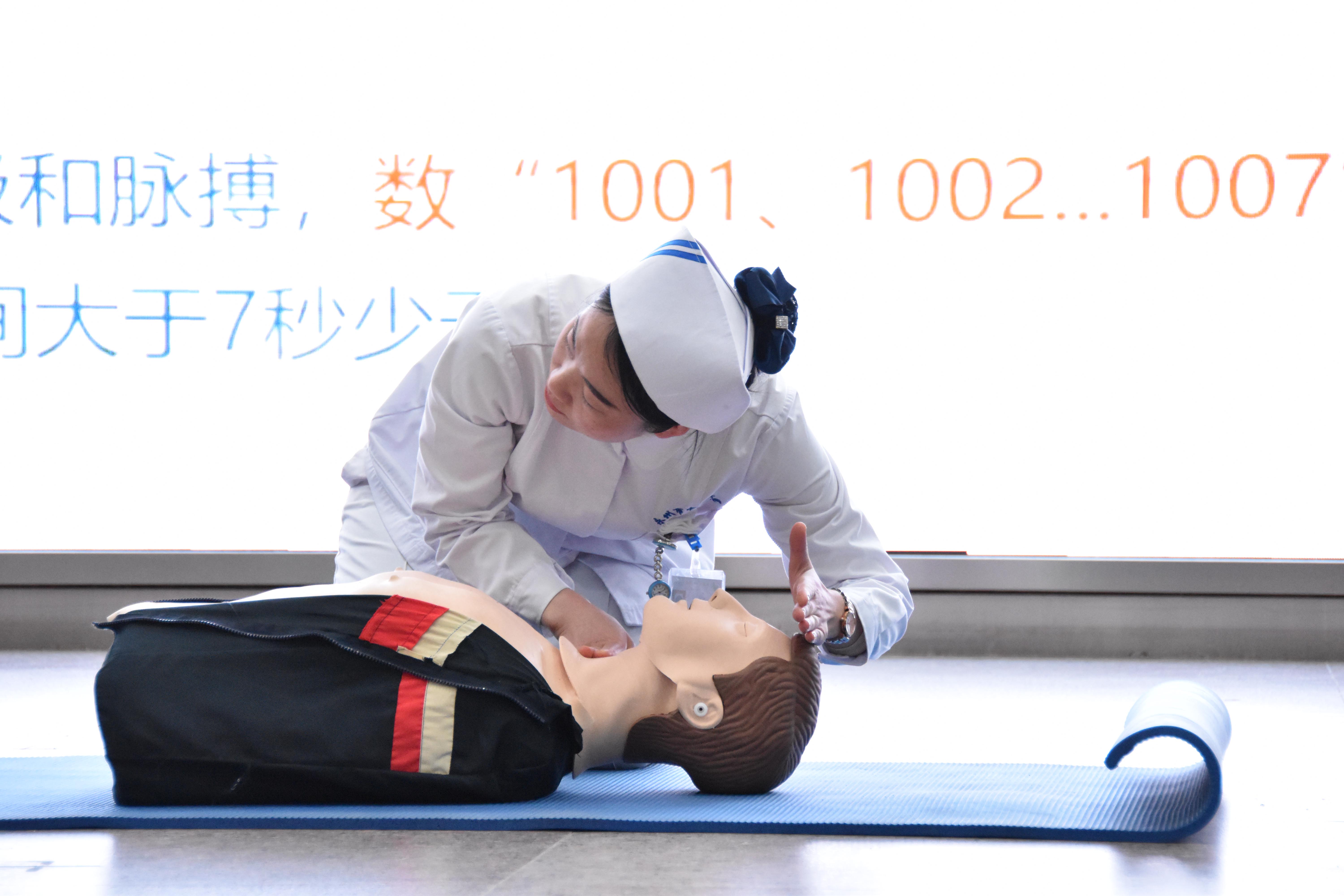 培训会上,现场救护培训导师进行了各类急救知识讲解及案例演示。导师们详细解读了《湖南省现场救护条例》,针对大学生在学习、生活中可能会遇到的突发状况以及如何开展有针对性的救护进行了讲解,重点包括现场救护“三个一”理念、现场心肺复苏、自动体外除颤仪(AED)的使用和气道异物梗阻、溺水、创伤等常用现场救护方法。导师们还开展了操作演示指导,数十名参加培训的大学生上台进行了救护演习。培训最后,导师团还对所有学员进行了现场考核,检验培训效果,进一步促进学员掌握现场救护理论知识、提升实践操作能力。