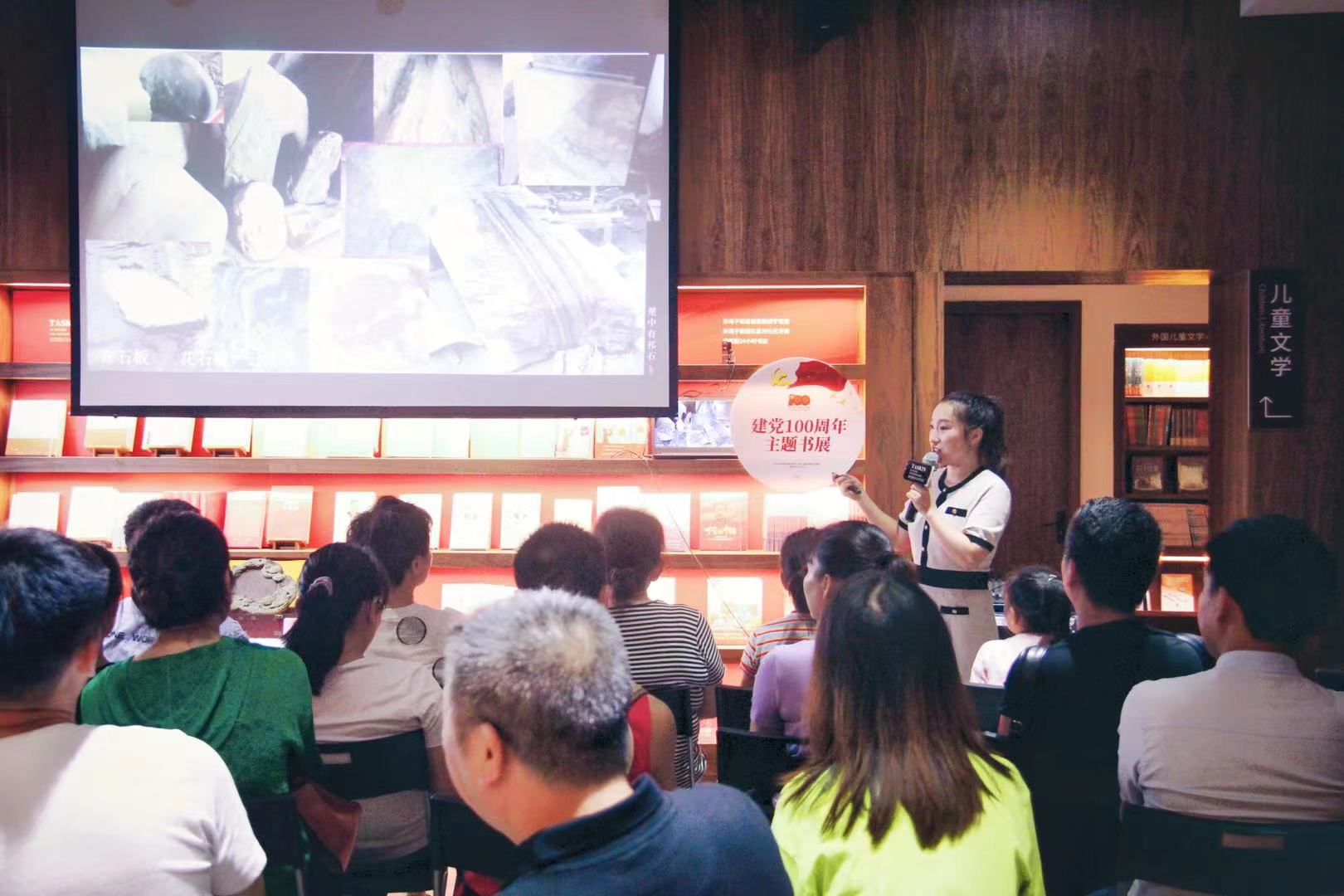 本网讯  近日,js9900金沙美术与艺术设计学院视觉传达系邓子戈老师为献礼建党100周年,于长沙德思勤城市广场书店开展社会艺术教育专题讲座,她以《楚中有祁石—湖南永州祁阳石文化赏析》为题,为社会艺术爱好者讲述了国家地理标志祁阳石相关知识,展现了永州的非遗文化无限魅力,大家纷纷表示此次讲座受益匪浅。此次讲座也是该院立足永州、服务地方,推广永州地方文化,响应国家美育“硬指标”,循序渐进做好高校艺术教育普惠大众的第一步。
