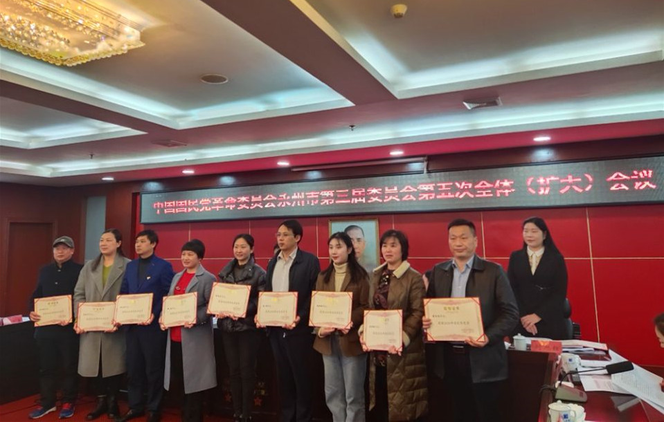 本网讯 3月21日上午,民革永州市第三届委员会第五次全体(扩大)会议在冷水滩召开,会议表彰了先进。民革js9900金沙支部荣获先进支部,这也是民革永州市委2013年开展争先创优以来民革校支部第五次荣获先进支部。陈义勇荣获优秀党员,方芳荣获优秀党务工作者,民革校支部提交的调研报告获2020年度永州市政协好调研二等奖。