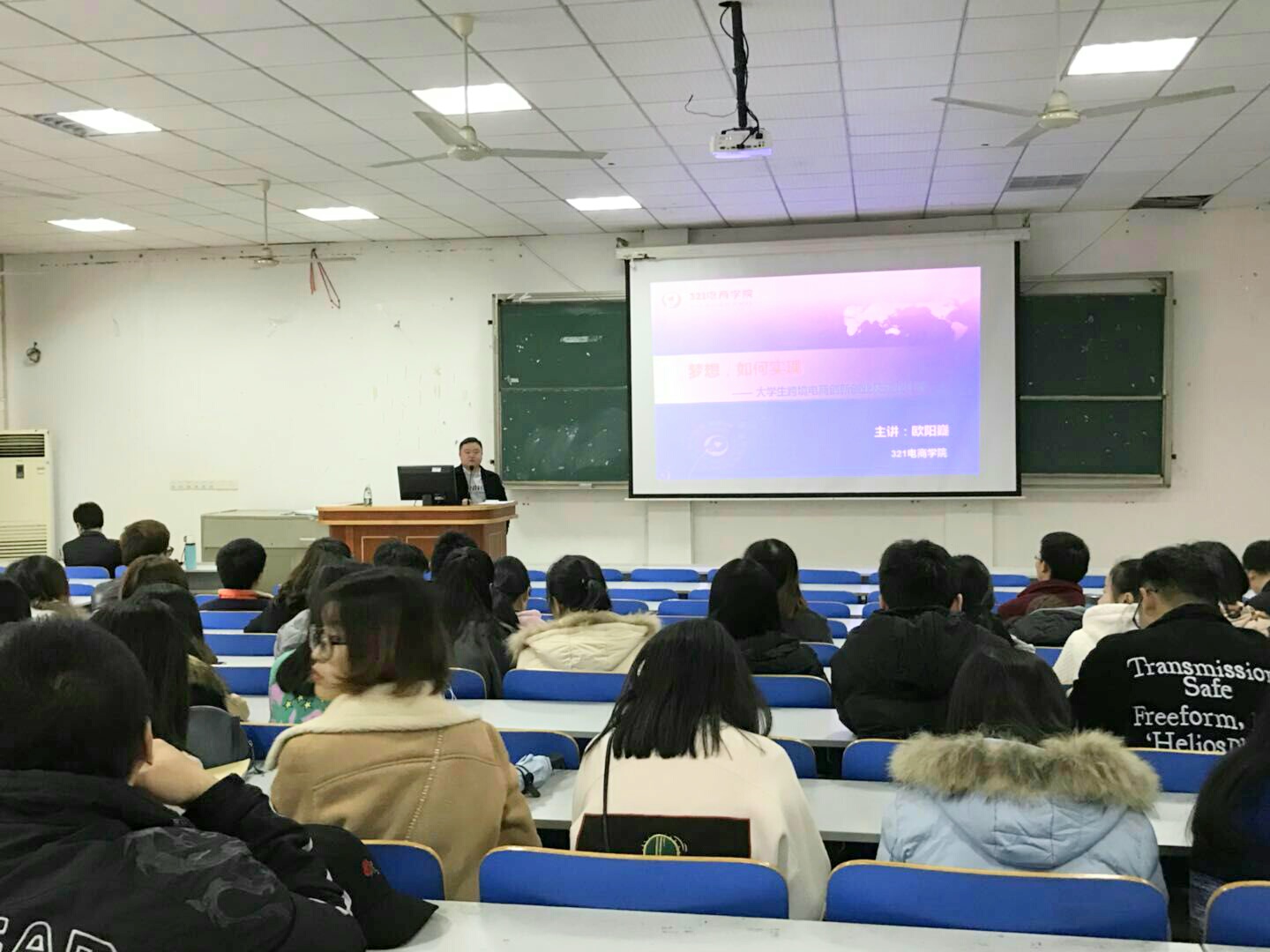 本网讯 11月22日上午,经济与管理学院邀请深圳321电商学院创始人欧阳嶷来校举办“大学生跨境电商创新创业及就业计划”主题讲座,该院院长李清泉、党总支书记胡清华以及2014级全体学生聆听讲座。