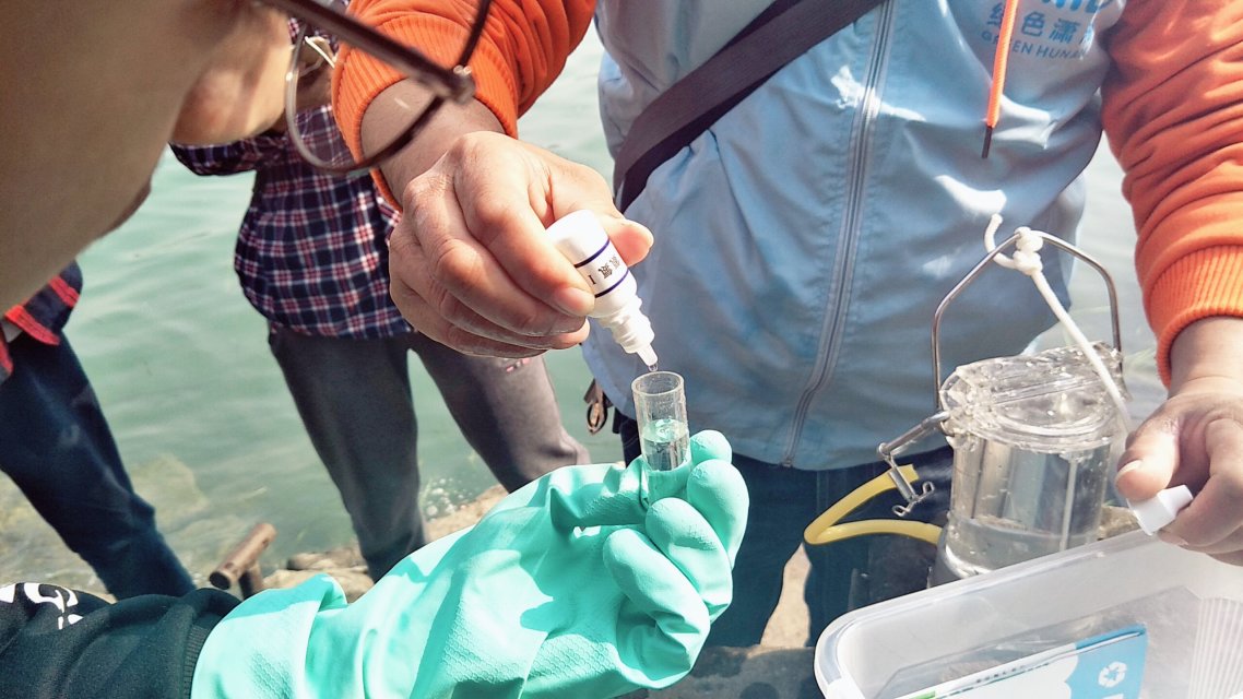 讲座结束后,志愿者来到潇水朝阳岩段进行水质检测。李龙老师和胡采云老师亲自示范,为大家讲解检测步骤,并鼓励大家大胆尝试,志愿者们也纷纷动手操作实践。