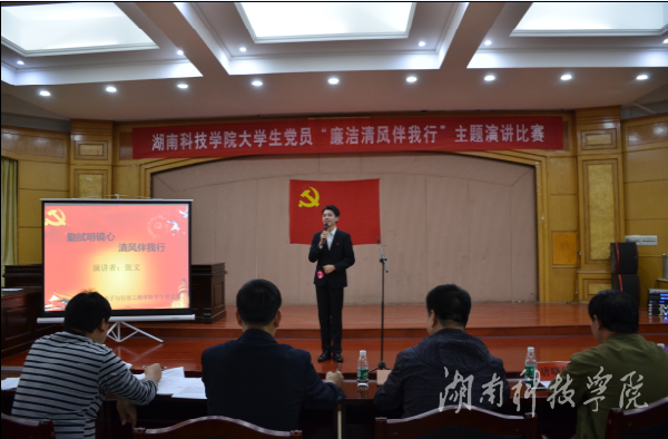 本网讯(通讯员 王佩莹 唐议侦)为进一步强化我校党风党纪教育, 10月25日晚,由学校组织部主办,人文与社会科学学院第三党学生党支部承办的“廉洁清风伴我行”主题演讲比赛举行。副校长程智开出席。