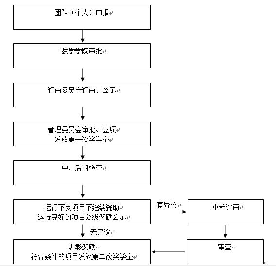 奖学金采取先立项,后评奖的方式进行。同一项目的奖学金分两次发放:一是项目立项后发放一次奖学金,即所有立项项目按同一标准发放创新创业启动资金;二是立项项目在中、后期检查后,分等级发放奖学金,即运行良好的项目按评审结果进行奖励,运行不良或中途停止的项目不继续奖励。