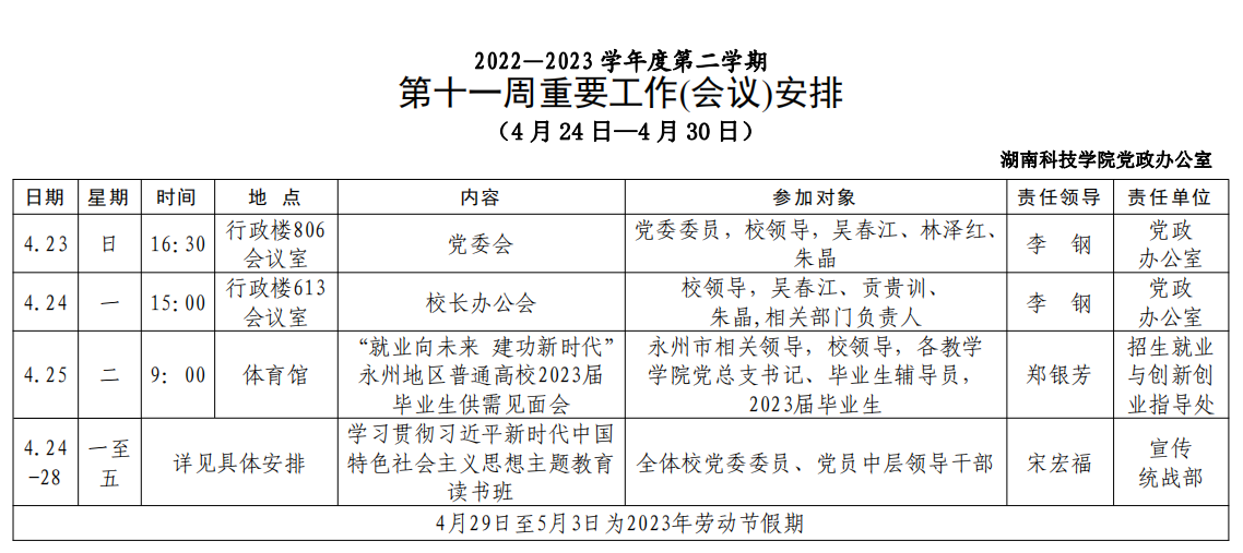 [党政办]第十一周重要工作(会议)安排(4 月 24 日—4 月 30 日)