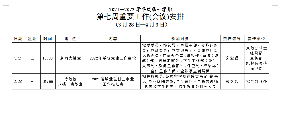 [党政办]第七周重要工作(会议)安排 (3 月 28 日—4 月 3 日)